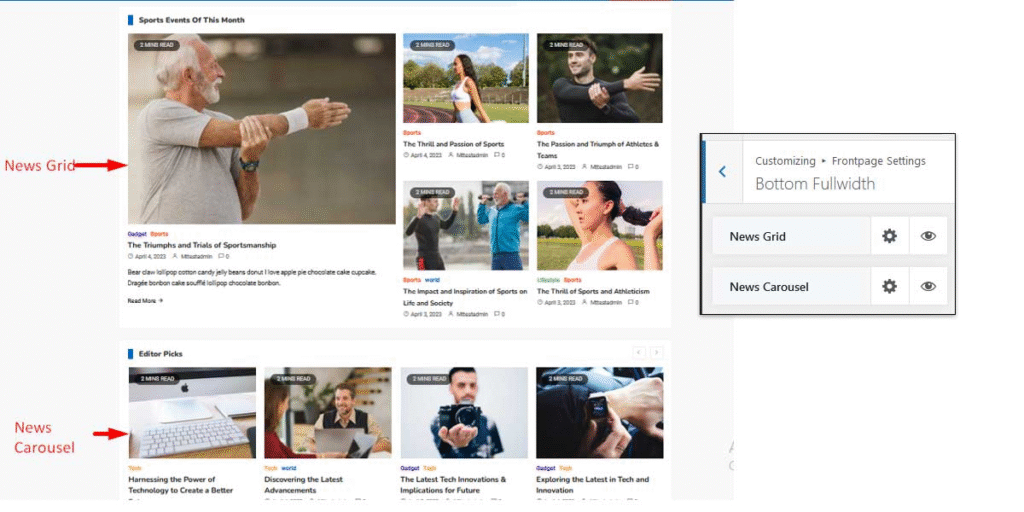 As the name suggests, Bottom FullWidth wraps all the contents that possibly falls at the bottom part of the site. It’s divided into two blocks: News Grid and News Carousel spanning across the full width of the screen.