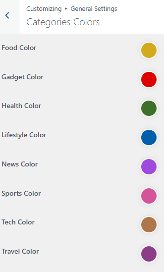 - Choose colors by clicking on the colored palettes beside each label and select your appropriate colors for your website and categories altogether.