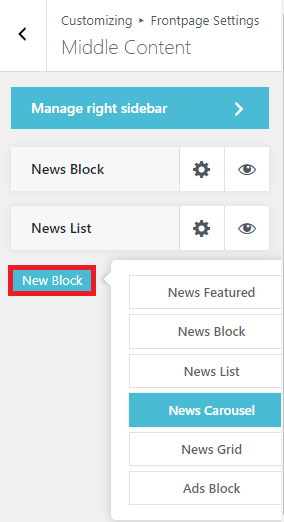 - Click on News Block button and then select any one of the available six blocks to add a new block in the middle section.