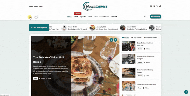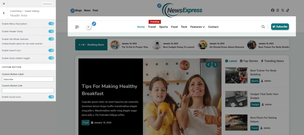 The Main Area Header is a header section in the News Express theme where you can place vital navigational menus along with a Site Mode Switcher, Search Icon, Sticky Sidebar Enabler, and a Custom Button.