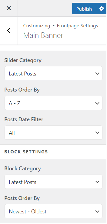 - For the slider and block settings, you are equipped with 3 DROP DOWN MENUS: Slider/Block Category, Posts Order by and Posts Date Filter.