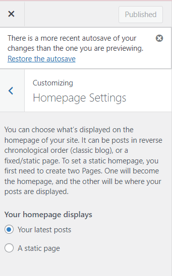 - You are given 2 radio options for your default homepage: Latest Posts or A Static Page