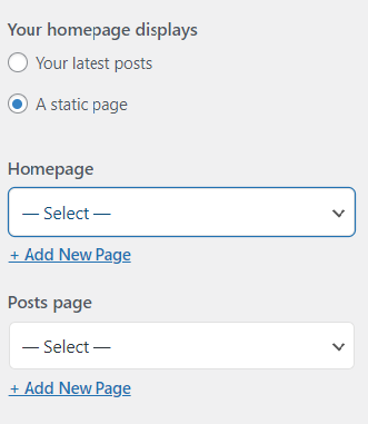 - In case you have set A static page for your homepage display, you have to select a previously created page for Homepage and a separate page for Post Page.