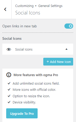- You can also toggle on or off the “Open in New Tab” option based on whether you want to display your social media page on a new tab or the same tab.