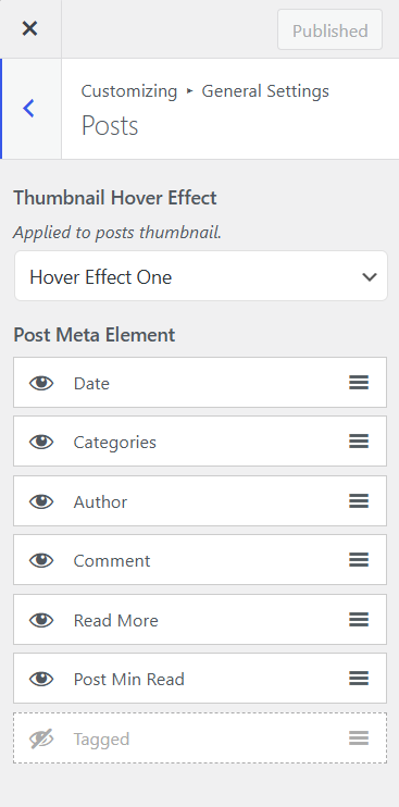 • At the top you’ll see a “Post Thumbnail Hover Effect” option. Click on the drop-down menu to choose from given two hover effect options.