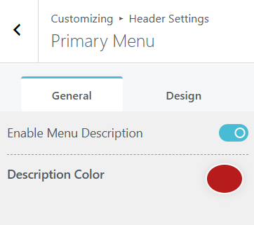 - In the General Tab, Toggle on ‘Enable Menu Description‘ and add color to it from the palette below.