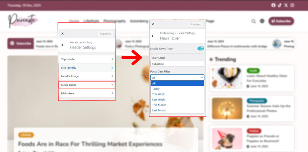 for example, you can choose ‘This Week’ or “Today” option to showcase latest publishment of your website on the ticker.